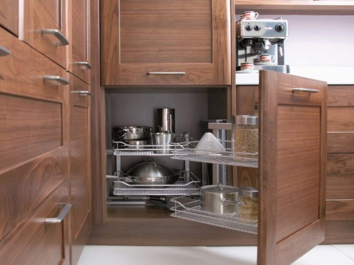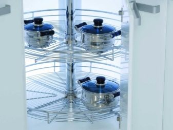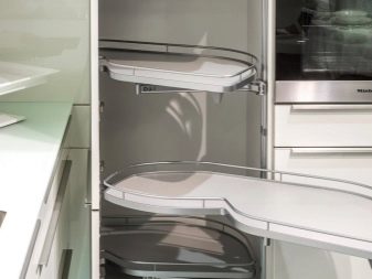 Venkovní kuchyňské skříňky se obvykle používají k ukládání hrnců, pánví, domácích spotřebičů. Aby bylo snadno přístupné jakékoli (i nejvzdálenější) místo, můžete použít systém kolotočů, který pomocí rotačního mechanismu umožní přístup ke všemu pohodlnému a funkčnímu. Toto je ideální řešení, které osvobodí hostesku od potřeby dřepět nebo se ohýbat, aby se získaly předměty, které jsou v hloubce.