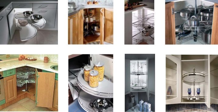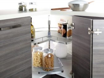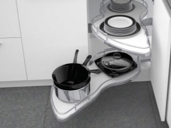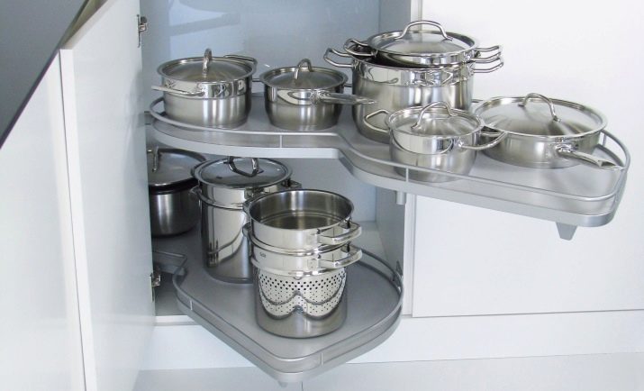 Také v těchto modulech můžete použít spolehlivou rohovou polici-karusel, který vydrží hmotnost od 7 do 15 kg. Dveře by měly být vybaveny spolehlivými zvedacími mechanismy, svorkami a zavírači.