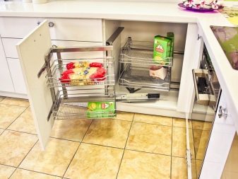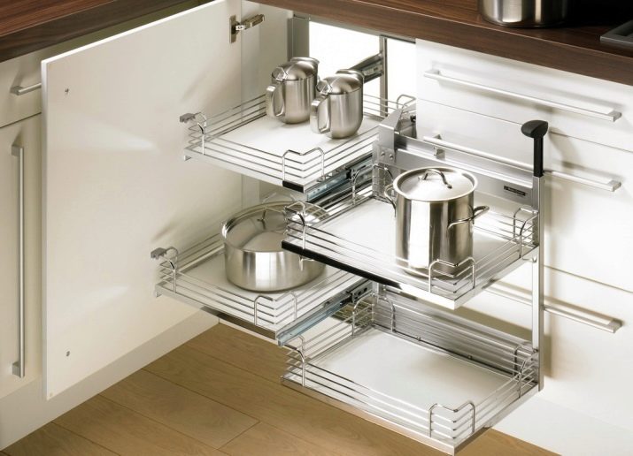 Spodní zásuvky ve skříňkách by měly být prostorné a plně roztažitelné, aby bylo zajištěno dobré osvětlení a hledání objektů. K dispozici je velký výběr zařízení a zařízení, která pomohou maximálně využít prostor kuchyně: různé výsuvné a sklopné koše, pouzdra na tužky, malé lahve, police typu kolotoč.