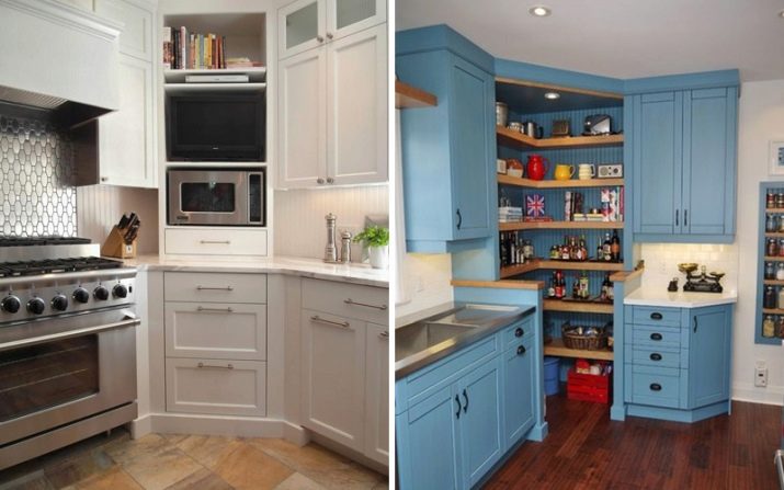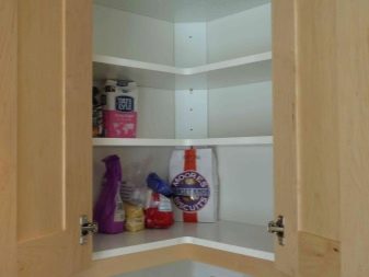 Skříňku na tupo lze namontovat poblíž rohového dřezu, dřezu - to je jeho velká výhoda. Pokud jde o nedostatky, je třeba poznamenat, že jeho prázdná zeď je nepřístupná.