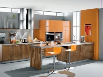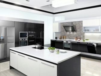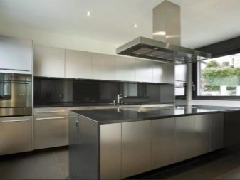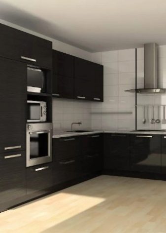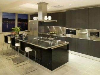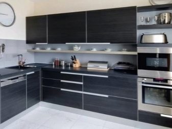Moderní kuchyně se zabudovanými spotřebiči se provádí ve dvou hlavních oblastech designu. V prvním případě mluvíme o moderně zařízeném interiéru hi-tech, moderní nebo dokonce futurismus. Protože ocelové povrchy dobře ladí s tmavými barvami náhlavní soupravy, mnoho návrhářů navrhuje ponechat přední panel zařízení otevřený a neodstraňovat jej za dveřmi.