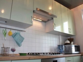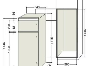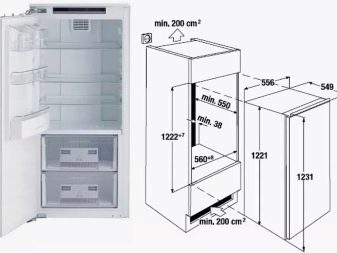 Vestavěná lednička se čistí buď v pouzdře na tužky, nebo v malém patře. Mimochodem, tato odrůda není vždy úplně „skrytá“ za dveřmi. Skříň vestavěné kapoty je vybrána tak, aby byla zavěšena a namontována tak, aby mezera mezi ní a sporákem byla 65 centimetrů.