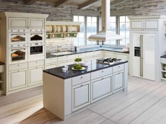 Ve druhém případě se jedná o kuchyně vyrobené ve velkém stylu retro, skandální, země nebo klasika. V tomto případě je veškerá zařízení skryta za fasádami, a proto barva náhlavní soupravy může být bílá, šedá nebo dokonce barevná.