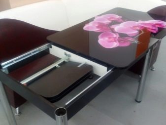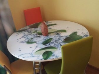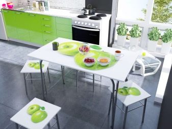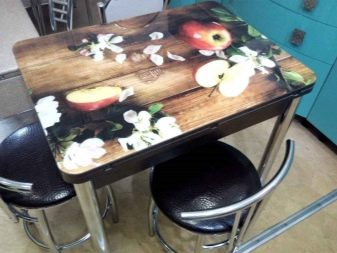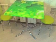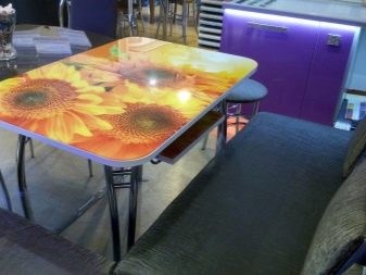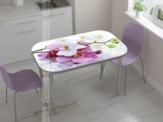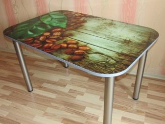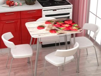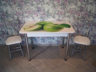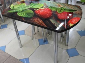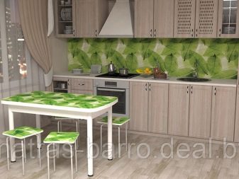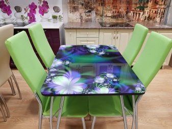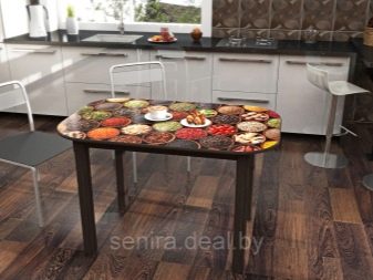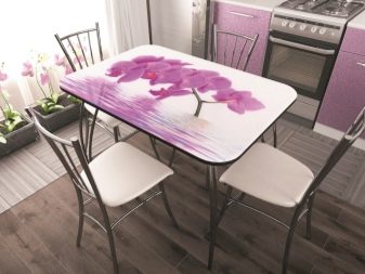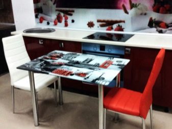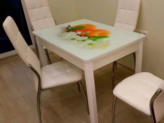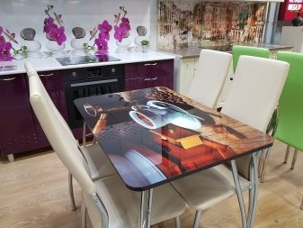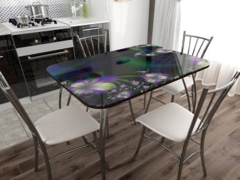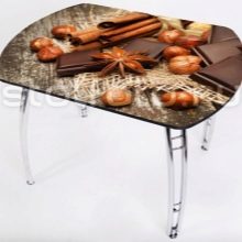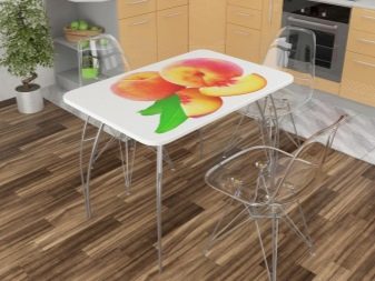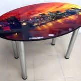 Při výběru modelu kuchyňského stolu je nutné zohlednit příslušenství stávajícího nábytku. Například musíte věnovat pozornost podobnosti materiálu nohou, jejich linearitě nebo zakřivení. Je důležité, aby si někdo koupil produkt se zabudovaným podsvícením, který poskytuje realističnost a hloubku tisku fotografií. Osvětlení zespodu může dát obrazu jedinečnost ve formě svíček i světel nočního města.