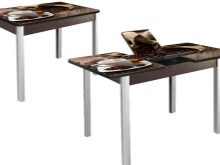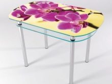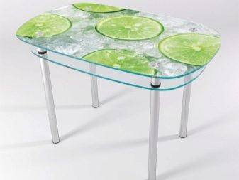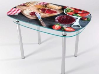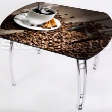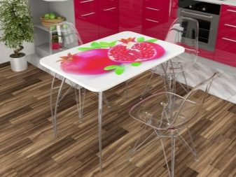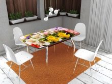 Hranaté analogy jsou prezentovány v obchodech ve dvou variantách: pro 4 a 8 osob. Rozměry těchto modelů jsou 80x80, 120x120 a 160x160 cm. Kulaté stoly s fototiskem vypadají elegantněji v interiéru kuchyně než rohové varianty a mohou se lišit v průměru od 80 do 160 cm. Oválné úpravy mají větší kapacitu, mohou být úzké a široké.