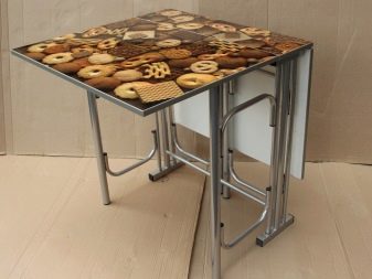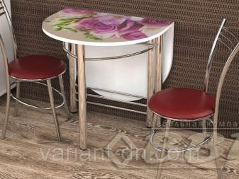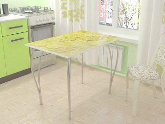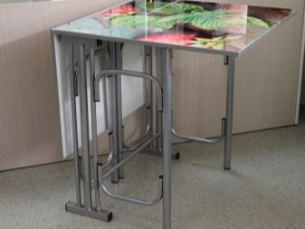 Kromě toho, že stoly s fotografickým tiskem mohou mít systémy skládacího typu, lze je také namontovat na zeď. Tyto výrobky jsou relevantní pro malé kuchyně, při nákupu konkrétní varianty v tomto případě však musíte věnovat zvláštní pozornost výsuvné noze.