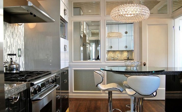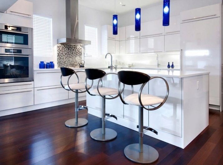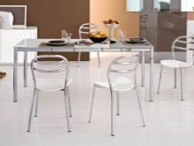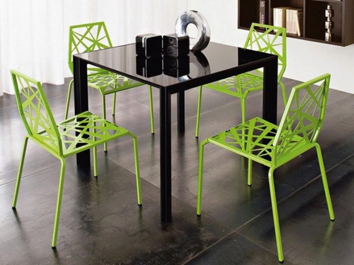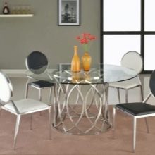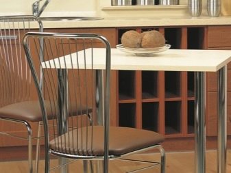 Zcela zřídka se setkávají zcela kovové kuchyňské židle. Za prvé, jsou drahé, a za druhé, jen málo lidí na nich ráda sedí: velmi chladno. Jejich sedadla mohou být vyrobena z různých materiálů a být měkká a tvrdá. Na této fotografii však pozorujeme pouze kovové výrobky doplněné tenkými polštářky. Jejich nespornou výhodou je, že stejně jako vzorky organického skla nezatěžují interiér.