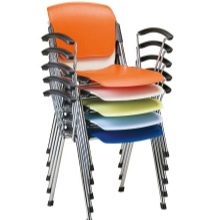 Tento obrázek ukazuje kovové kovové židle přiléhající k plastovým židlím zahrnutým do jídelny.