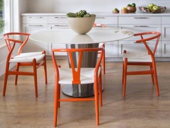 Barevný nábytek se dobře kombinuje s mnoha návrhy interiérů, pokud je barva vybrána správně. Mnoho majitelů kupuje sadu židlí, v nichž jsou všechny kopie natřeny v různých barvách. Chcete-li dát kuchyni teplo a zábavu, můžete se podívat ve směru červené, zelené a žluté barvy. Milovníci přísnosti jsou vhodné produkty v bílé a černé barvě.