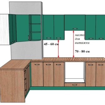 Nezapomeňte na přítomnost potrubí a digestoří, protože ovlivňují hloubku skříně. Někdy je proto nutné celý design změnit a další skříňky se zvětšují. S tím není nic špatného, ale u malých místností budou skříňky, které jsou příliš hluboké, vypadat masivně. A tak se používá systém standardní velikosti - od 70 do 90 cm. Hloubka podle normy nepřesahuje 30–40 cm. Maximální vzdálenost mezi spodní a horní skříní dosahuje až 70 cm. Přesto jsou v podstatě všechny parametry individuální.