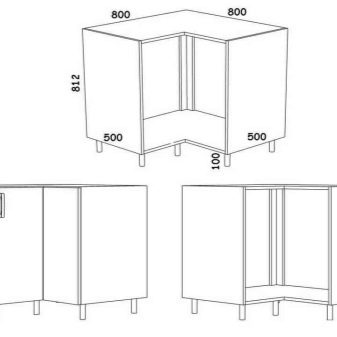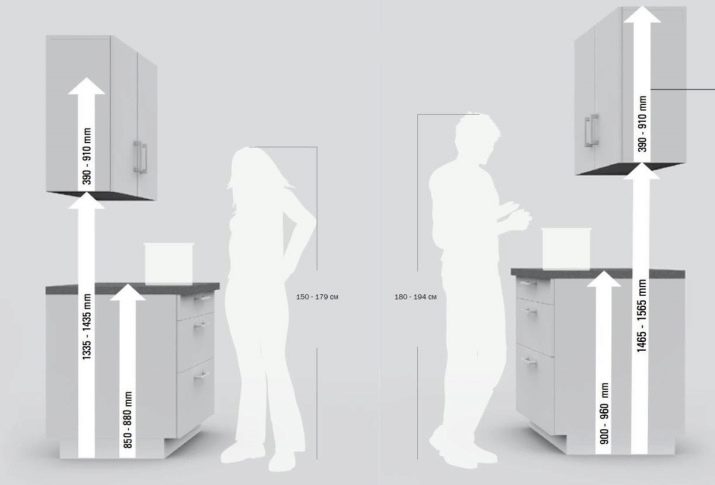 Výška spodních skříní je 70 cm, bez nohou a pracovních desek. To znamená, že v plné verzi, při zohlednění plně zkroucených nohou a pracovních desek, se výška otočí z přibližně 92 na 95 cm. To vše je navrženo speciálně pro nastavení ke zvýšení nebo naopak ke snížení výšky skříně. Takové modely obvykle pocházejí z továren a závodů. Vlastní mistři se ale také uchylují k této jednoduché možnosti.