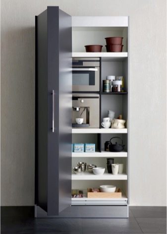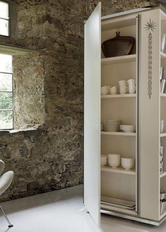 Může být namontován nebo venku. Navíc může kombinovat obě. Skříňka je instalována na speciálních nohách, stejně jako veškerý podlahový nábytek. Je určen k ukládání potravin, jídel nebo domácích chemikálií.