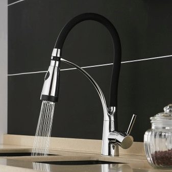 - S výsuvnou hubicí. Tento design svým designem připomíná běžnou sprchu. Délka konve může dosahovat jeden a půl metru a během používání je navržena improvizovaná sprcha. Díky tomuto řešení můžete použít konvici k mytí blízkých předmětů, stejně jako velké množství jídel. Také v těchto produktech má provzdušňovací režim, který vám umožňuje kvalitně umýt zeleň.