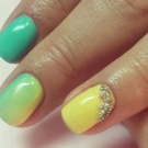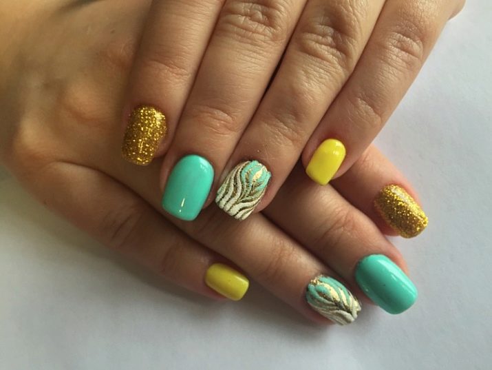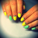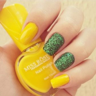 - Lesklý lesk se střídavými nehty. Nyní se taková kombinace stává klasikou: hřebíky na středu a prstenu jsou malovány v jedné barvě a zbytek v jiné. Použitím žluté a zelené barvy v manikúru můžete střídat povlak, jak chcete, můžete ho dokonce střídat přes jeden hřebík. V každém případě to dopadne krásně.