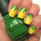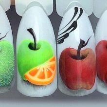 - Jablka a zelené. Jablka žlutého ráje se často používají k vytváření otisků na nehtech a jsou samozřejmě zdobena zelenými listy.