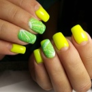 Zelená a žlutá jsou barvy přírody. A mohou být perfektně použity jako paleta pro vytváření květinových ozdob na nehtech. Pomocí těchto tónů můžete zobrazit různé prvky.
