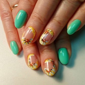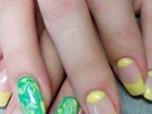 - Francouzská manikúra v moderním stylu. Pokud dříve byly použity pouze klasické růžové a bílé tóny, nyní se také používají neočekávané kombinace. Jedním z nich může být zelená a žlutá francouzská manikúra.