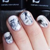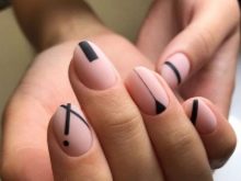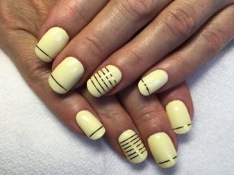 - Černé pruhy nebudou fungovat pro jemnou manikúru, ale vypadají harmonicky leskle. To je skvělá volba pro manikúru na dovolenou. K výrobě těchto proužků doma můžete použít zlatý lak nebo tenké proužky fólie. Je možné použít lak s tenkým štětcem a spoustou jisker.