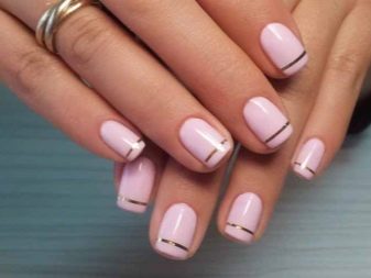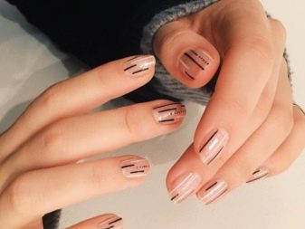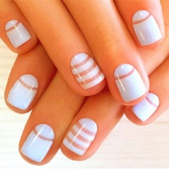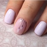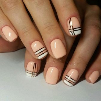 - Jednobarevný povlak s pruhy je klasický typ manikúry. Je ideální pro krátké nehty a vizuálně je přitahuje. Proužky vypadají skvěle na béžové a světle růžové. Pruhy mohou být uspořádány chaotickým způsobem. Může to být několik vodorovných nebo svislých pruhů. Nebo jsou umístěny v jakémkoli úhlu a protínají se.