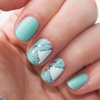 - Stylový a neobvyklý design se získá při použití proužků vícebarevné fólie. Taková práce vyžaduje více času a dovedností od mistra. Připravené proužky jsou naneseny na nehtový povlak v jiném pořadí a fixovány pomocí průhledného vrchu.
