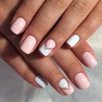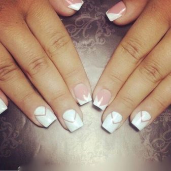 - Trojúhelníková francouzština Vhodné pro kreativní a obchodní ženy. Bunda sama o sobě může být světle růžová, broskevová, máta nebo klasická bílá. Takovou manikúru lze provést na krátkých nehtech obdélníkového nebo mandlového tvaru.