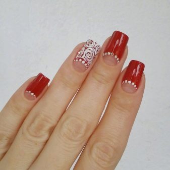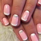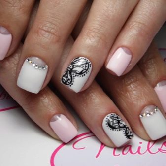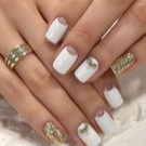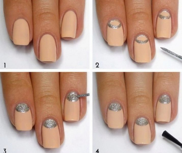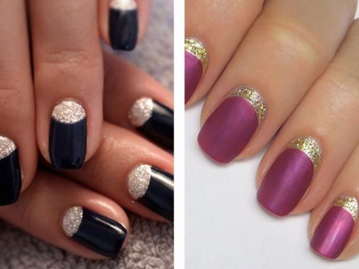 Mezi nejelegantnější možnosti patří přidání měsíční manikúry s zářícími částicemi a kamínky. V tomto případě můžete získat celou řadu efektů. Kovová třecí nebo zrcadlová manikúra dodá hřebům chytlavý styl, tato volba bude vyhovovat mladým a odvážným. Nenápadný průsvitný třpyt je vhodný pro každý den s twistem. Kamínky, které lze umístit do řady, vyplnit celý hřebík, jeho část nebo z nich vytvořit celé vzory, pomohou přidat do nehtů luxusní lesk.