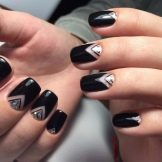 Lunuly nemusí být nutně kulaté a oválné. Geometrie je trendová: můžete je nakreslit přímkou podél úhlopříčky, čtverce nebo módního trojúhelníku. Zvláště se rozlišují nehty s jasnými lunulami nasycených nebo tmavých odstínů. Obvykle se vyznačují světlejšími barvami, ale nasycené barvy přitahují k sobě více pozornosti. Zadní díry jsou dalším populárním trendem, který se doporučuje zejména majitelům krátkých nehtů, takže je vizuálně delší. V této technice jsou nejen plochy na základně hřebu, ale také jeho boční části natřeny kontrastní barvou. Nejmódnější barvou je kombinace stříbrného kovu na okraji s černými nebo nahými odstíny.