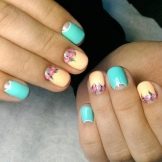 Šťavnatá duha čistých květin na nehtech je stále populární. Otvory, stejně jako hlavní povlak, mohou mít na každém prstu různé barvy. V módní kombinaci jahod a vanilky, máty a melounu. Mléčná čokoláda je dobrá v matném provedení a úspěšně se kombinuje s průhlednými nebo nebarvenými otvory. Stejného efektu lze dosáhnout při kombinaci s nahými otvory v barvě vínové, černé nebo tmavě zelené. V lunule můžete použít průhledný lak, takže nezůstane zcela bez povlaku.
