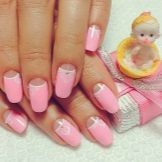 Tento design vypadá dobře na jakémkoli tvaru a délce hřebíků, vejde všechny prsty do jakéhokoli tvaru. Díky svému velkolepému vzhledu je povlak velmi demokratický a cenově dostupný pro každou ženu. Můžete to udělat doma. K tomu nejsou zapotřebí žádné speciální nástroje nebo vybavení. Je zapotřebí pouze lak kontrastního odstínu. A když provádíte techniku negativního prostoru, můžete se bez ní úplně obejít. Pokud si nejste jisti tvrdostí vašich rukou a správností budoucí linie, vezměte si na pomoc speciální šablony ve tvaru koblihy, které můžete udělat sami.