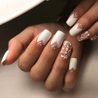 Výběr technik a povlaků vypadá zajímavě a neobvykle. Můžete střídat například lesklý podklad a matnou lunulu. V jedné manikuře lze také použít 3-4 techniky. Zároveň design nebude vypadat nemotorně nebo objemně, protože na každém hřebu se nepoužívají více než dvě techniky. V jedné manikuře tedy často používáte vzor monogramů, kamínky a dvojité díry. Můžete kombinovat techniku „rozbitého skla“, reverzní bundy a módní geometrie. Ve svatební manikuře se používají volumetrické výlisky, krajkové malby, kamínky a díry.