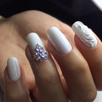 Zdobení lunuly pomůže vyřezávat z 3D materiálu a dalších objemových prvků. Tato možnost by měla být vybrána pro nejslavnější události, jako je svatební manikúra. Můžete se hýčkat objemným realistickým designem a jít na dovolenou. Prvky mohou být umístěny přímo na lunule, podél jejího okraje nebo strany. V této verzi je lunula často vyrobena šikmo, téměř od rohu k rohu, a je zdůrazněna přízvukem korálků a objemných květin.