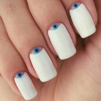 Dvojité díry milují mladé lidi. Tento design obvykle kombinuje módní karamelové a ovocné barvy. Druhá díra je často průhledná nebo lesklá. Dalším novým efektem je vzor ve formě stylizovaného oka na bílé díře. Takový vzor je všude v Turecku milován. Předpokládá se, že chrání před zlým okem. Původní design díry lze provést pomocí teček. Pod obrysem díry lze umístit několik bodů. A oblast uvnitř je natřena kontrastní barvou nebo ponechána volná.