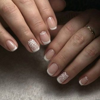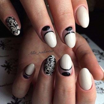 Rádi kombinují měsíční manikúru s obrázkem. Navíc se nejčastěji provádí pouze na přízvučné nehty. Můžete umístit vzorek na hlavní barvu nehtu a nechat díru volnou a bezbarvou. Další možností je černobílý podstavec a lunula malované vzory. Nejběžnější vzory jsou závoj, monogramy, květiny a další květinové motivy. Často kreslí tematický nebo sezónní design. Poté jsou hřebíky pokryty orientálními jasnými vzory, podzimní listí, sněhové vločky nebo srdce.