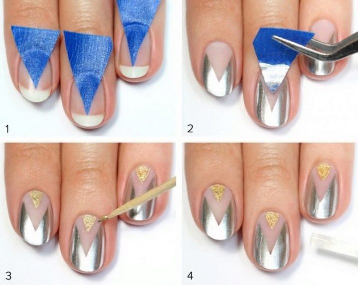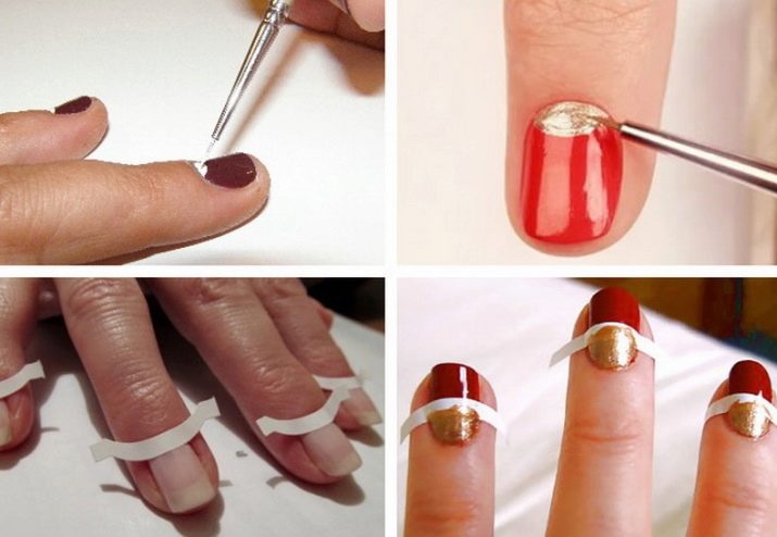 - Na každý úzký hřeb přilepte v ostrém úhlu (asi 30-45 stupňů) 2 úzké proužky lepicí pásky. Můžete použít speciální manikúru, pravidelné tiskoviny nebo kousky maskovací pásky.
