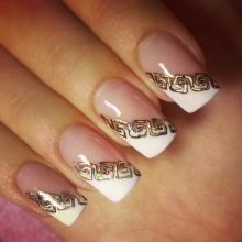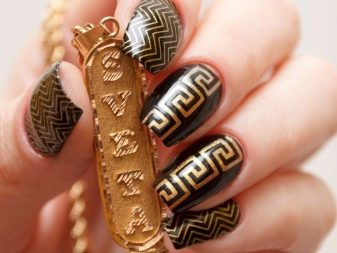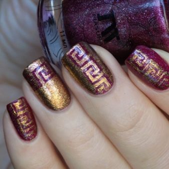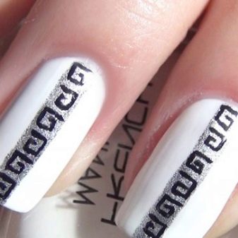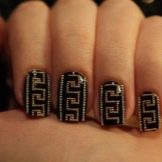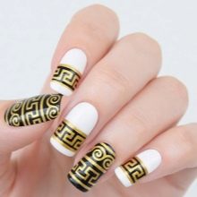 Grafický styl dokonale zapadá do myšlenky řecké manikúry. Chcete-li to provést, nakreslete dva pruhy na obou stranách ornamentu. Taková kompozice může být umístěna buď přímo nebo šikmo na jeden nebo více hřebů.