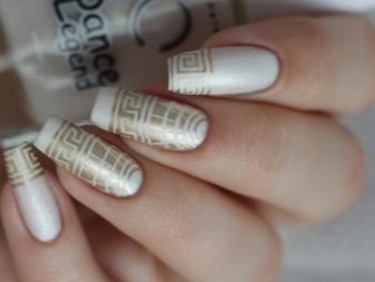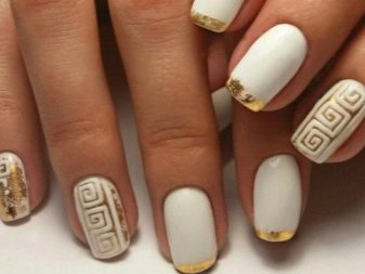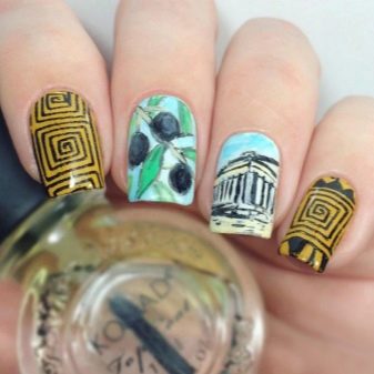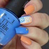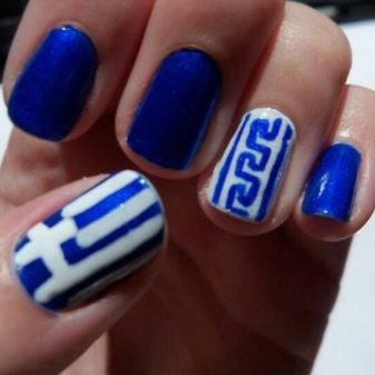 Tento typ nehtového designu má mnoho možností. Řecká manikúra může zahrnovat nejen kresbu vlajky země, ale také charakteristické vzory. Historicky se v Řecku používaly pro dekoraci a dekorace světlé barvy, ale v případě potřeby je lze zředit jasným odstínem vhodným pro obraz.