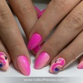- elegantní korálový růžový gradient na oválných nehtech s kresbou hlavy plameňáka;
