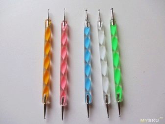 Musíte se zásobit tečkami s různými tryskami, tenkým kartáčem a jehlou.Kromě toho možná budete potřebovat štětec pro smíchání různých laků a kusu fólie, ze kterého budete muset vytvořit dočasnou paletu. Naklonění je na fotografii lekce, která jasně ukazuje, co a co by se mělo udělat, aby se získal realistický design.