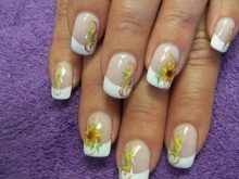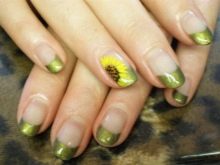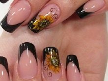Francouzština vždy vypadá stylově. Pokud ji zředíte dalším prvkem, například květinou, stane se taková manikúra elegantnější a obzvláště ženská. Černá hrana vypadá neobvykle, ale vkusně. Není třeba vyplňovat každý hřebíček květenství, pár slunečnic nasycuje celý design. Taková manikúra bude vyhovovat obrazu romantické, sofistikované dámy.