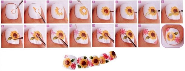 V nehtovém umění existují různé způsoby nanášení laku, gelu, top, použití pěnové gumy, vody, novin, fólie, párátka. Vše záleží na představivosti specialisty a na přání klienta. Pro vytvoření manikúry se slunečnicemi je možné použít několik technik.