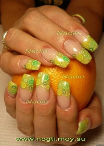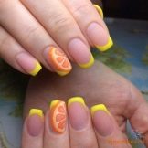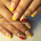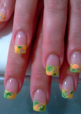 - Fimo. Použití tohoto typu šperků nejen výrazně zjednodušuje práci na tvorbě designu, ale také otevírá téměř neomezené možnosti pro realizaci vašich nejdivočejších myšlenek. Různé srdce, luky, motýly a zejména všechny druhy ovoce budou vynikajícím doplňkem francouzské manikúry ve žluté barvě.
