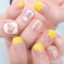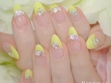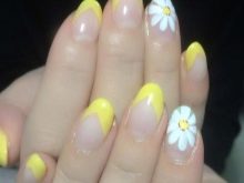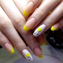 Květiny vypadají chytlavě a neobvykle v kombinaci se žlutou francouzskou bundou, ať už se jedná o malé bílé sedmikrásky, nedbalé „rozptýlené“ na nehty, nebo velké, které zabírají celý volný prostor nehtové desky.