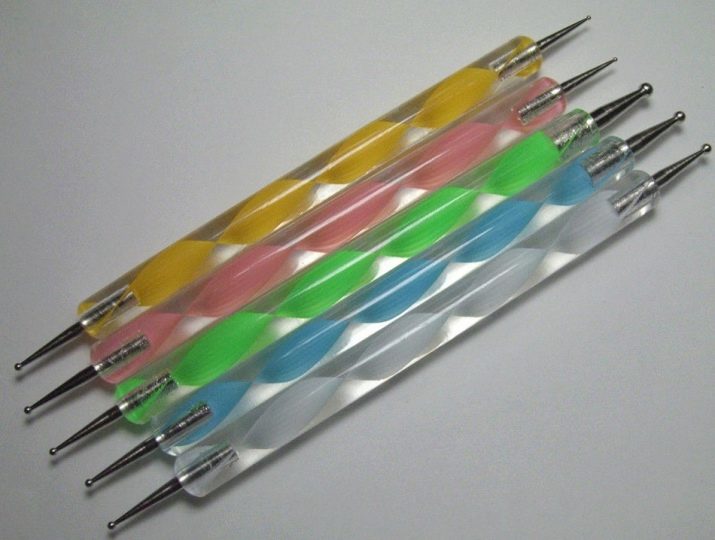 - Tečky S tímto nepostradatelným nástrojem jsou běžné květiny zobrazeny se třemi až pěti okvětními lístky. V závislosti na průměru tečky je možné použít velmi malé i velké květy. Tečky se velmi snadno používají: stačí namočit hlavu správné velikosti do laku a vytvořit květ pomocí tečkovaných pohybů.