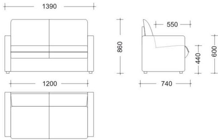 Malá pohovka má následující parametry: délka 139 cm, hloubka 74 cm. Produkt je složen dopředu o 180 cm. Pokud odečtete rozměry zábradlí a přidáte vysoký hřbet, může být lůžko v jeho čisté formě 120 x 180 cm, to znamená, že má velikost půl lůžka. . Pro přeměnu manželského lůžka (160x200 cm) by měla být pohovka vybrána bez madel, 160 cm dlouhá.