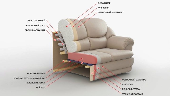 Pohovka není omezena na čalounění. Uvnitř sestává struktura z rámu, skládacího mechanismu a výplně. Všechny komponenty pro výrobu vyžadují různé typy materiálů a měly by být posuzovány samostatně.