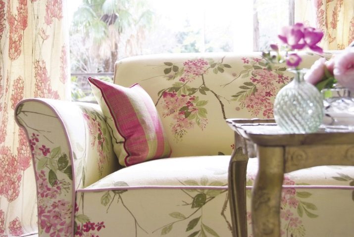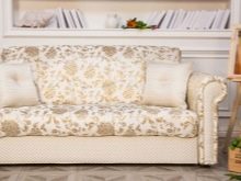 V obývacích pokojích můžete umístit „eurobooky“ s květinovým potiskem nebo grafickými vzory. Pod nimi je nutné vyzvednout závěsy. To není na škodu doplnit takové pohovky s měkkými polštáři, zdobené volánky.