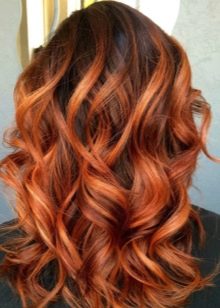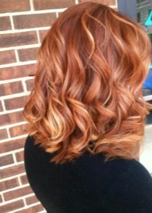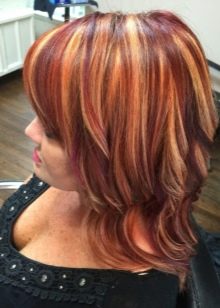 U této krásné a zářivé barvy se používá částečné barvení k ještě většímu důrazu na vlasy. Kromě toho prameny jiného odstínu pomohou zdůraznit krásu střihu na ohnivých vlasech. Jako nejvyhledávanější barvy se používají světlé nebo studené odstíny blond, prameny jsou malovány do kaštanové barvy, navíc zvýraznění černým výrazem na rudých vlasech značně. U kreativních dívek mistři doporučují přidat k obrázku jas pomocí červené.