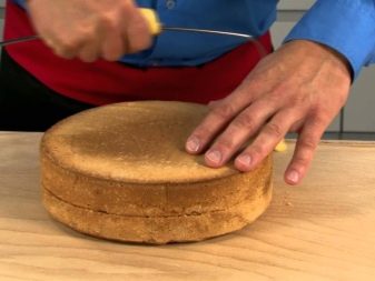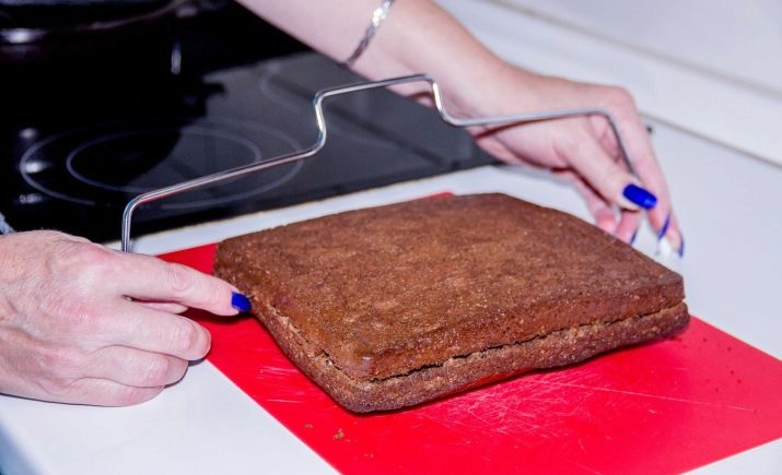 Použití nože s dlouhou čepelí je docela jednoduché, hlavní věc je, že sušenka je zcela ochlazená a uvnitř není lepkavá. Pro pomoc začátečníkům byly vyvinuty speciální plastové tácky, které vytvářejí stejné dorty s milimetrovou přesností. Jsou to dvě plastové „nohy“ s úchyty a děleními na několika úrovních.