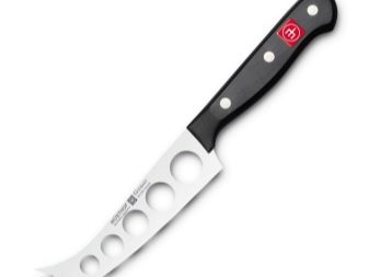 - Pro měkké sýry. Tento nůž má speciální otvory v samotné čepeli, takže sýr se na plátky nepřilepí. U některých nožů vypadá špička jako vidlička. Pomocí něj můžete přenášet plátky sýra na talíř, abyste tyto manipulace neprováděli rukama.