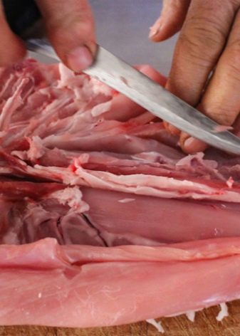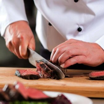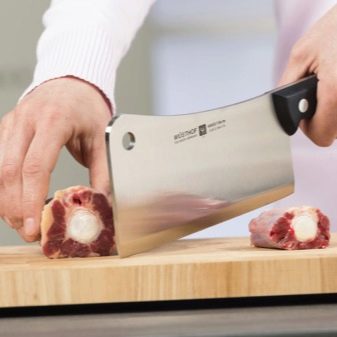 - Pro krájení masa. Tvar nože je pečlivě promyšlen pro rychlé zpracování kusů syrového masa jakékoli velikosti, které mohou být často velmi husté nebo dokonce šlachovité. Až do okamžiku se nůž zvětší a čepel bude mírně zakřivená, aby se zvýšila pohodlí při práci.